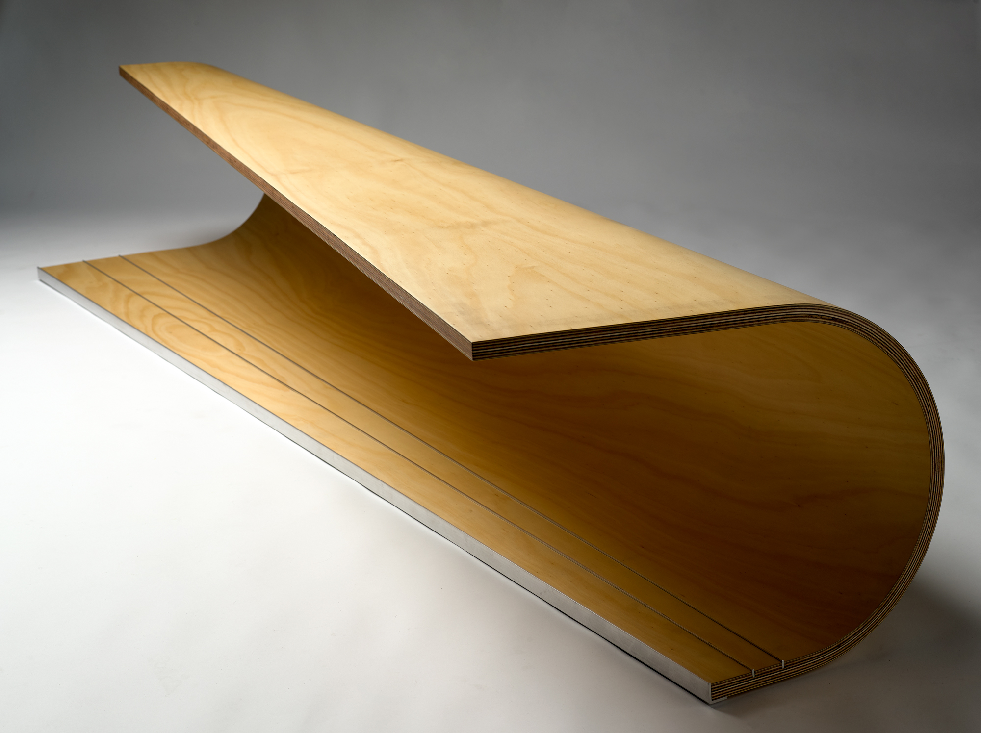 on edge than flat, and from celery top pine being suitable for bending into curves, as in boatbuilding. The form of Warp Bench is partly inspired by the accumulative tension that sometimes occurs in a piece of weaving, causing the warp strands to become more tightly pinched toward the middle. The blonde colour of the wood and the splayed curves are to me evocative of water runnels across a beach, or the strand–like tension within a tree trunk.